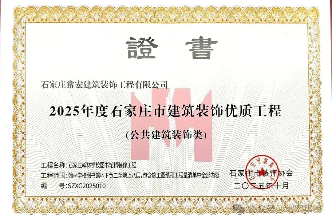 在年度優(yōu)質(zhì)工程評選中,由常宏裝飾承建的石家莊翰林學(xué)校圖書館精裝修工程,憑借其優(yōu)異的工程質(zhì)量榮獲 “2025年度石家莊市建筑裝飾優(yōu)質(zhì)工程” 榮譽稱號。
