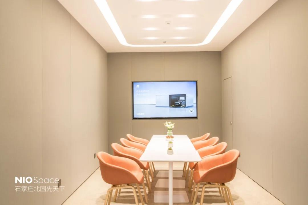 嵌入式的收納家具,使整個空間輕盈不負(fù)擔(dān);小小的一段拉簾,將展廳和會議室(平時(shí)可做辦公室)分開,加上灰色地毯、灰色硬包、灰色拉簾等搭配,溫馨的空間布局、時(shí)尚的NIO Life陳列,讓這個空間有了愉悅的體驗(yàn),將整個空間構(gòu)建成一個家的感覺。