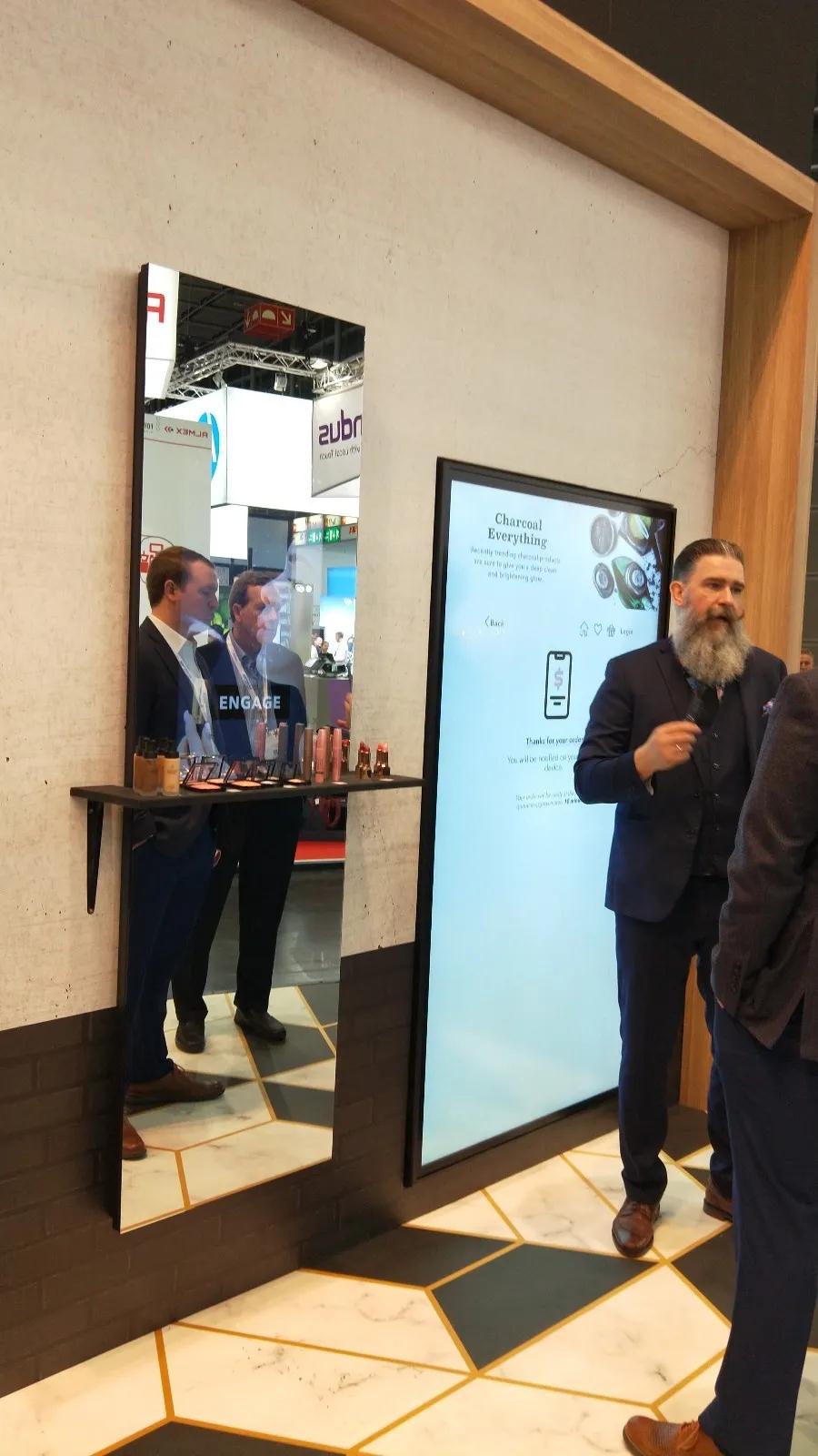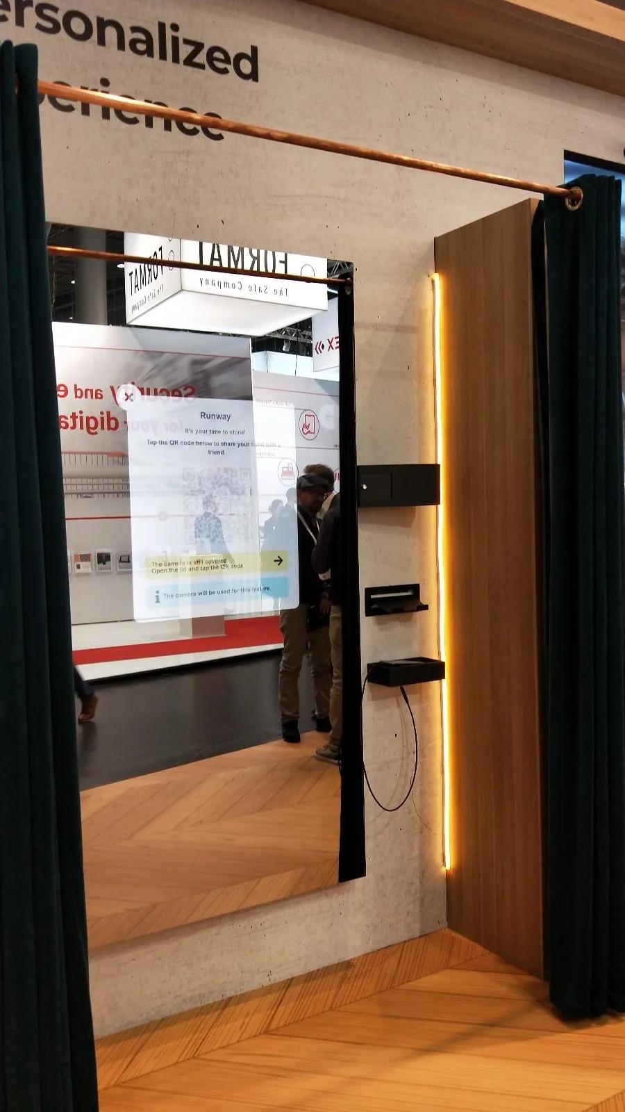 下面一組是智能試衣間,人在里面不但可以照鏡子,還可以選取與自己所選衣服合適的搭配(如帽子、眼睛、手套)并下單購買。同時(shí),這個(gè)魔鏡有視頻錄制功能,可以360度全方位觀察自己所選衣物是否合身。如果需要更換衣物可以在不出試衣間的前提下提示服務(wù)人員為您送上合適的款式。