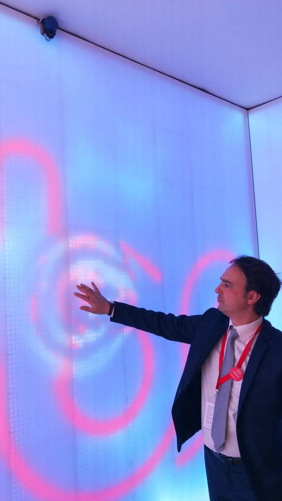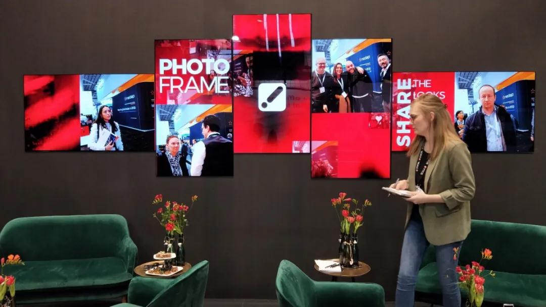 這組屏幕拼接方式很獨(dú)特,每塊屏幕大概只有10毫米的厚度。實(shí)時(shí)捕捉著現(xiàn)場參與體驗(yàn)的人群。