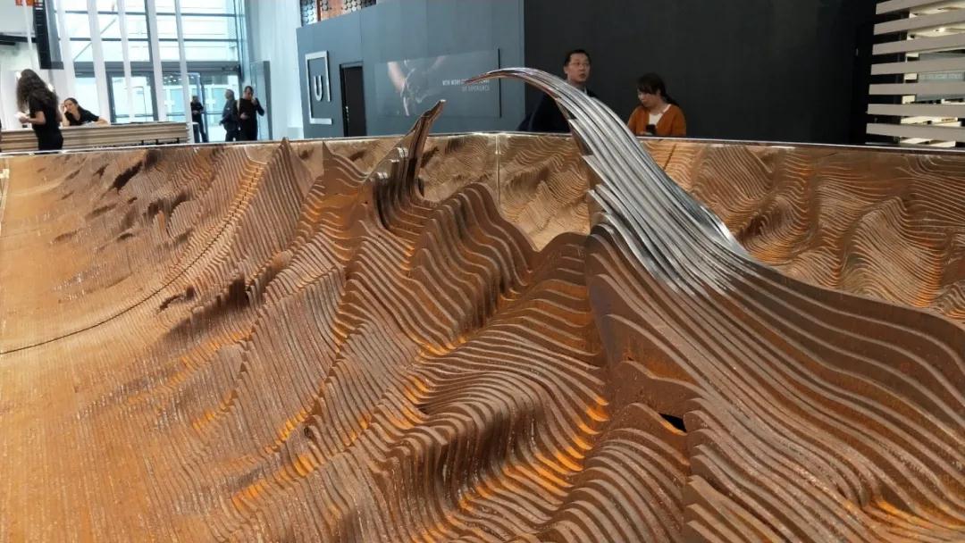 迎面而來的是接待區(qū),在此設(shè)計公司給大家呈現(xiàn)了一組鋼制的雕塑。這個雕塑像山脈、似浮云,鋼鐵的堅硬與柔軟的外觀形成鮮明的對比。整個雕塑沉浸在一個箱體中,露出來的部分代表是設(shè)計的結(jié)果,是最靚麗動人的部分。而雕塑大部分則是沉浸在箱體中,復(fù)雜而多變,代表著設(shè)計背后復(fù)雜而大量的工作。頓時“感同身受”。